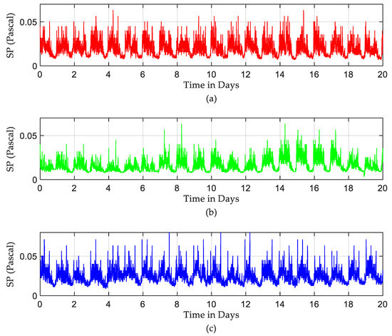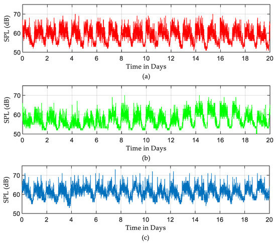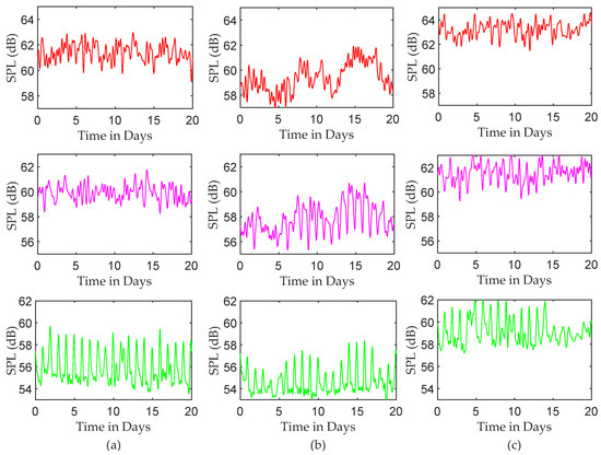Actual pattens of sound levels in pascal over 20 days: (a) ICU1, (b) ICU2, and (c) ICU3.