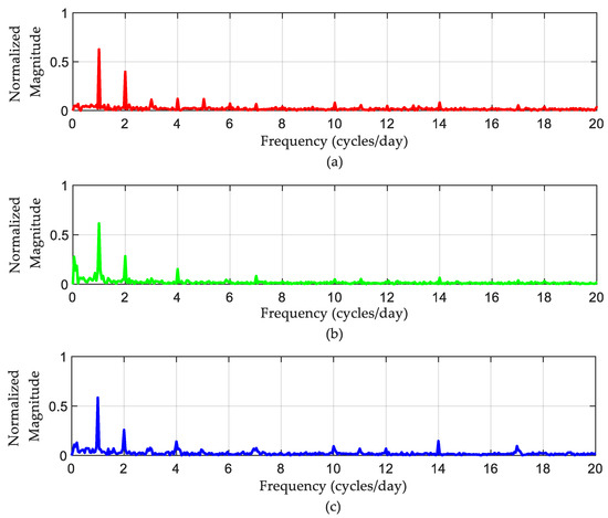 Figure 5 shows the results of the spectral analysis of those SPL measurements obtained in Figure 4. The magnitudes of the FFT output are plotted against a frequency axis scaled to cycles/day. Dominant frequency components can be observed in the low-frequency region, corresponding to 1, 2, 3, and 4 cycles/day, respectively. Those components can therefore be taken as an indicator of how often noisy events occur during the day. The noisiest events occur once or twice daily, while the events occurring more often are weaker.