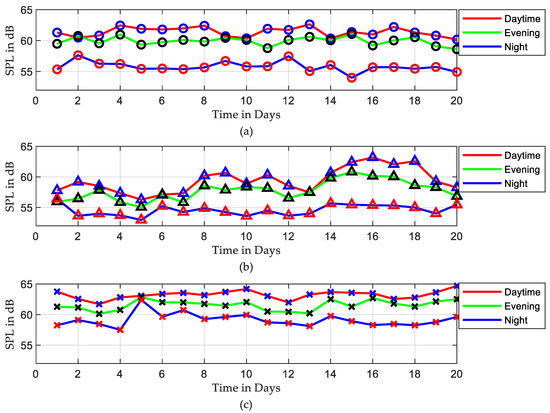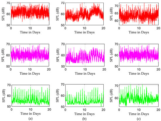 Recorded SPLs in dB over 20 days: (a) ICU1, (b) ICU2, and (c) ICU3.