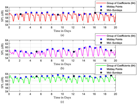 Finally, Figure 10 shows the reconstructed time series of SPLs for three different periods using a similar approach, i.e., the IFFT results when only the first 64 FFT coefficients are used. While each ICU data provides a level of periodicity in the reconstructed time series, most of the periodicity is generated from the sound levels of the night periods. It is obvious, as seen in Figure 10, that the acoustic environments are almost the same during the night.