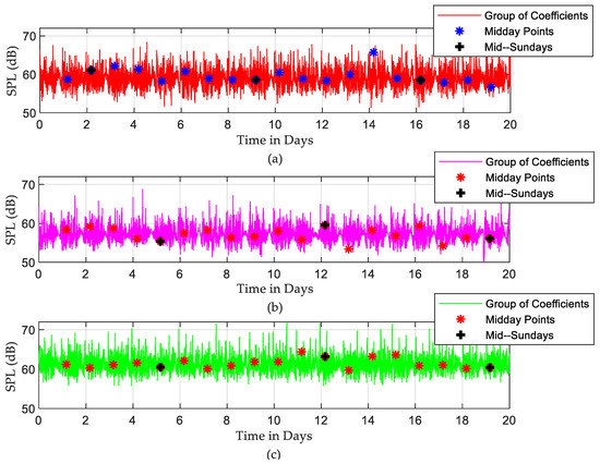 To analyse the existing periodicities in the recorded SPLs, the determined Fourier decomposition coefficients are grouped, and the inverse of the Fourier transform (IFFT) is performed. The reconstructed SPLs using only the first 64 FFT coefficients are shown in Figure 8. In this way, the periodic noisy events are separated from the random events, and the periodic patterns can be seen more clearly. Midday and mid-Sunday points for each day and weekend, respectively, are also indicated in this plot. The rest of the coefficients are plotted in Figure 9, which mostly shows the random part of the recorded SPL time series. The variances of the random parts are 4.783, 3.408, and 3.963 for ICU1, ICU2, and ICU3, respectively, which represent a very significant contribution to the random noisy events in the recorded SPLs. What is perhaps even more important is that the magnitudes of those random events are generally significantly higher compared to the periodic ones. Midday points (noon) are almost the noisiest times in the periodic signal due to increased activity levels around this period. They consistently coincide with daily peak positions in the periodic pattern but are not surprisingly randomly distributed in the random part of the recorded SPLs. On Saturday and Sunday (weekends), low sound levels were obtained since daily activities in the ICU were reduced due to variations in staffing numbers and visitors.