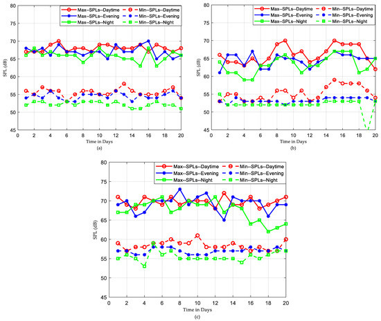 The min and max SPLs during daytime, evening, and night over 20 days for (a) ICU1, (b) ICU2, and (c) ICU3.