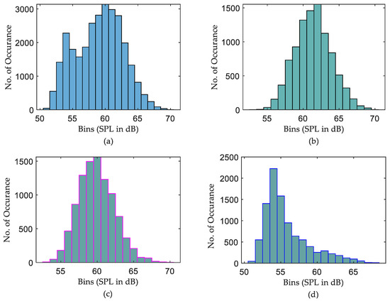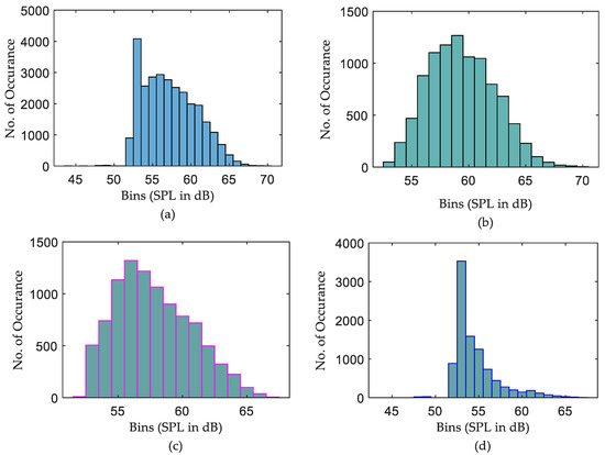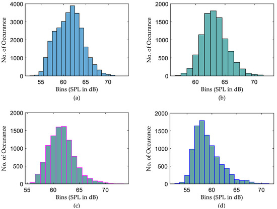 Histogram calculation of ICU2 data over 20 days, (a) distribution of SPLs over the entire period, (b) distribution of SPLs over daytime, (c) distribution of SPLs over evening, and (d) distribution of SPLs over night.