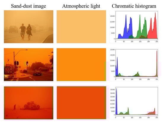 Figure 1 shows sand-dust image examples and their corresponding atmospheric light images and histograms. As shown in Figure 1, the acquired images appear to be overall yellow or even red because blue and green light is absorbed by sand-dust particles much more easily than red light. The aim of sand-dust image enhancement is real-time correction of these severe color casts and improvement of image contrast and detail. Since sand-dust images have different color distribution characteristics from hazy or underwater images, direct application of haze removal [,,,] or underwater image enhancement methods [,,] to sand-dust images can lead to unsatisfactory results. Thus, sand-dust image enhancement is a more challenging problem than conventional dehazing or underwater image enhancement.