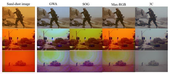 The GWA, SOG, and max-RGB methods work on the same assumption that a different order of the Minkowski norm of the reflectance in a scene is achromatic. These color correction algorithms only consider the coincidence of chromatic means of the three channels, but not the SDs of the color channels. The 3C method is based on balancing two opponent color pairs toward the origin. All methods tend to equalize the mean of each color component. In most cases, during the sand-dust image color correction, the SD of the blue channel increases significantly when the weak blue channel is strengthened. This produces bluish or purplish images. Figure 3 presents color-compensated sand-dust image examples. As shown in Figure 3, the GWA, SOG, and max-RGB algorithms fail to recover severe color shifts in reddish sample images. The 3C method does not successfully enhance the sand-dust images, either.