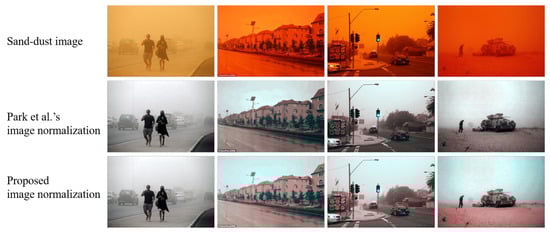Figure 4 illustrates the results of the green-mean-preserving normalization and the proposed background-luminance-preserving image normalization methods. Each normalization algorithm is followed by the color correction technique of (1). As shown in Figure 4, the normalization results of a non-severe sand-dust image (the first column in Figure 4) are similar. However, the two normalization algorithms achieve different correction results for severe sand-dust image samples. The results using Park et al.’s [] method produce grayish corrected images, where the red component is particularly strongly reduced. On the contrary, the proposed normalization technique generates more colorful correction images. From this comparison, it can be concluded that the background luminance preservation can effectively ensure the consistency of the mean of the color channels.