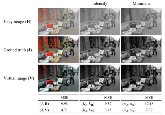 Figure 5 shows a virtual image obtained using the simplified GCP for a sample hazy image with ground truth. As shown in Figure 5, haze is effectively removed from the obtained virtual image, which demonstrates a reasonable restoration of intensity and minimum values. However, it also exhibits poor restoration of color, manifested by dimmed color in the corrected images. The mean squared error (MSE) between the ground truth (J) and hazy image (H) is 9.93. The MSE between the ground truth (J) and gamma-corrected virtual image (V) is reduced to 4.71. Furthermore, the MSE between Kv and KJ is 3.45, and the MSE between mv and mJ is 2.32. In conclusion, a virtual image V can effectively be used as an initial image to estimate the transmission map.