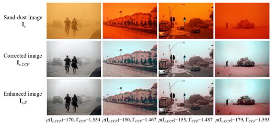 • Enhancement—A dehazing framework is adopted to enhance color-corrected sand-dust images. The saturation-based transmission map estimation [] is modified using the gamma correction technique. An image-adaptive gamma value is used to estimate the transmission map;