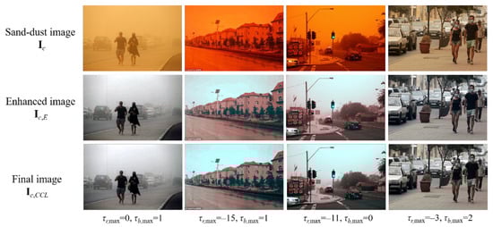 Figure 7 shows several examples of the resultant enhanced image samples using the final color correction algorithm. In the corrected image with a light sand-dust effect in the first column from the left, the maximum lag values corresponding to the red and blue histograms are negligible. The enhanced image in the second column has τr,max = −15 and τr,max = 1, which results in a reduced red component, indicating a more robust image enhancement. In the last column, an enhanced image with a slightly reduced red and slightly strengthened blue channel is demonstrated. In conclusion, the cross-correlation-based final color correction strategy can adaptively shift the chromatic histograms and fine-tune the color cast.