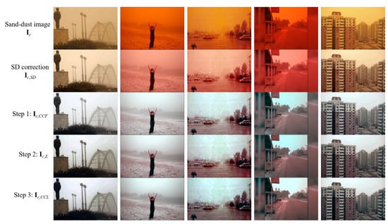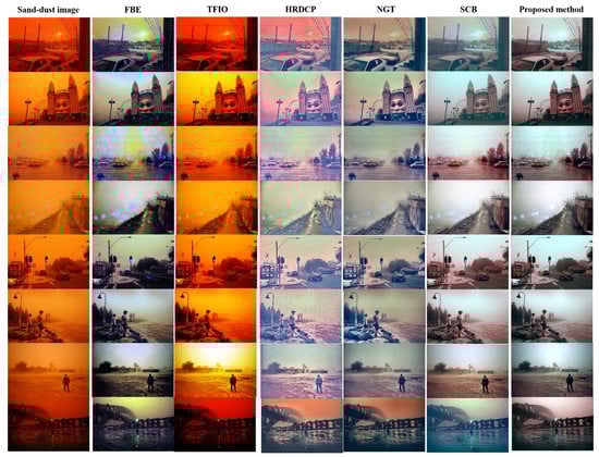 Figure 9 illustrates the intermediate results of the presented enhancement process. The SD weight-based correction algorithm is designed to obtain the chromatic variance consistency. Therefore, the intermediate image Ic,SD has not yet removed the sand-dust veil, as shown in the second row of Figure 9. The sand-dust veil is removed after applying the proposed background-luminance-preserving image normalization algorithm. The obtained image Ic,CCF can be used as an enhanced result when the hazy effect on the sand-dust image is weak. To eliminate the hazy effect, we introduce the dehazing framework. The result of the fourth row of Figure 9 shows the result Ic,E of performing haze removal on Ic,CCF. Because the dehazing is basically accompanied by image sharpening, color information can be distorted. Therefore, the proposed method finally uses the pixel shifting method to remove color distortion caused by the haze removal. The fifth row of Figure 9 presents the final corrected result Ic,CCL. The result images are enhanced, and slight color casts are restored. From the results of the ablation study, it is believed that the quantitative metric values for enhanced sand-dust images do not yet have great reliability. Therefore, we compare our method with the existing methods based on the subjective image quality even though the quantitative metric values are reduced.