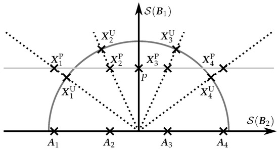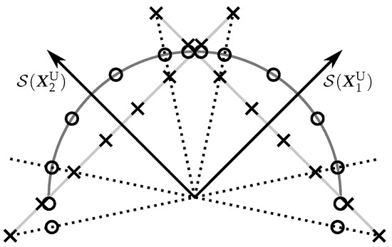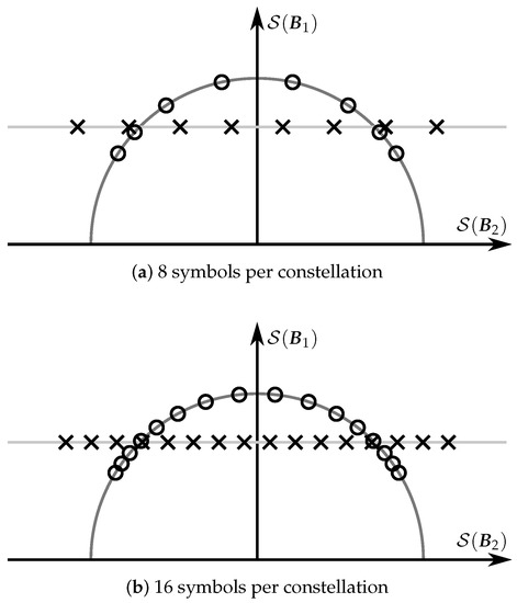 A two-dimensional graphical representation of this constellation construction method is depicted in Figure 5. The figure illustrates one of the benefits of this method: the constellation elements are more homogeneously distributed in the semicircle than in Figure 3. In addition to a composition of orthonormalized PSAMs, the constellation admits another interpretation. In particular, it can be seen as a generalization of a PSAM orthonormalization in which data are encoded also in the pilots, or, more specifically, in the location of the pilot matrix within a channel block. This location is given by the USTM matrices in . It is important to note that, assuming is small enough, both constructing using numerical optimization tools and storing and is feasible.