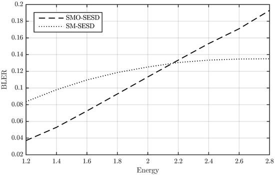 We verified this effect in the constellations of Figure 2. In particular, we studied how the PSAM matrix energy affects the BLER of the SM-SESD and SMO-SESD transmitter-receiver configurations with . This result is depicted in Figure 4, where the energy of the i-th PSAM matrix was computed as . The figure confirms that the orthonormalization is beneficial below certain energy of the PSAM matrix.