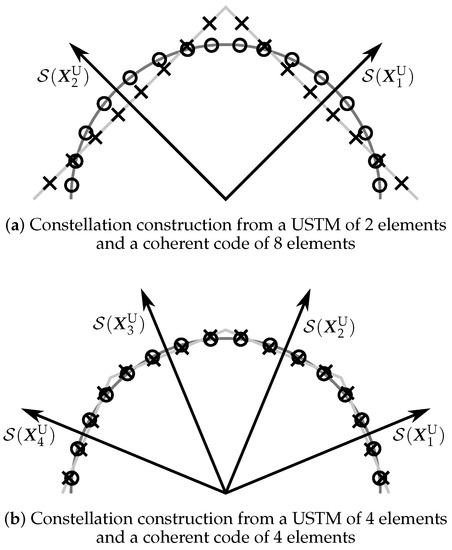 If , the PSAM is constructed by concatenating and the matrices in . Although these are the most extensively used values for and , the (more general) definition of PSAM matrices in (3) provides a new interpretation of a PSAM, which will be used in Section 5 to design new constellations that combine coherent codes and USTMs. In addition to this, the orthogonal matrices and enable a two-dimensional graphical representation of the different constellations, as shown in Figure 1. In the figure, the -dimensional subspace spanned by , , is represented in the horizontal axis, and the M-dimensional subspace spanned by , , in the vertical axis. The PSAM matrices can be viewed as shifts of the coherent code signals through the subspace spanned by . As a result, these matrices have, in general, different energy, although this will ultimately depend on the coherent code. However, the USTM matrices have always the same energy, independently of how the USTM was constructed. In Figure 1, we highlight an interesting case in which the elements of a PSAM and a USTM span the same subspaces. In the following section, we will show that this case is not exceptional, i.e., it is always possible to find this type of PSAM-USTM pairs.