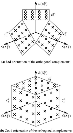 We will use this lemma with the subspaces and , . In particular, Lemma 1 implies that we can find such that , . We will use this result with a contradiction argument. Let us assume that we can find i such that is not invertible. This implies that has, at least, one orthogonal direction to , or, in other words, that there is a vector such that for all . Since is the orthogonal complement of , then the direction orthogonal to is in the subspace spanned by this basis, i.e., . In this case, and cannot span , which contradicts Lemma 1.