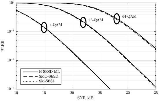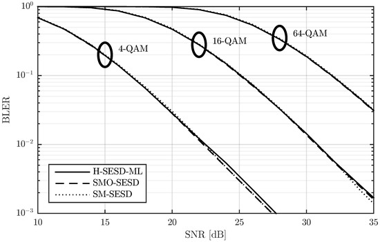We first compare the BLER of these configurations for , T equal to 4, 8 and 16, and for three QAM sizes: 4-QAM, 16-QAM, and 64-QAM. The BLER is depicted in Figure 9, Figure 10 and Figure 11 for , , and , respectively. The figures show that the performance of the three configurations is very similar. SMO-SESD is slightly better than SM-SESD and the performance of H-SESD-ML with respect to the other two configurations depends on the particular case. However, it is important to note that the constellation used in the H-SESD-ML configuration has more elements than those used in the other configurations. In particular, the constellations of the SM-SESD and SMO-SESD have elements, and the constellation used in the H-SESD-ML configuration has elements, where equals 2, 4 and 8 for 4-QAM, 16-QAM and 64-QAM, respectively. As a consequence, the bits transmitted per channel use are different for each configuration, as shown in Table 1. Therefore, the BLER obtained with the H-SESD-ML configuration cannot be directly compared.