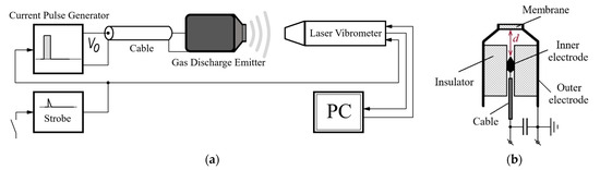 The experimental setup includes a gas discharge emitter of acoustic waves, communication line and current pulse generator, as well as a scanning laser Doppler vibrometer PSV-500-3D-HV (Polytec, Germany), as shown in Figure 1. The discharge was excited by using a home-made current pulse generator with an output voltage of V0 < 12 kV and short-circuit current up to1 kA. In the experiments, the pulse repetition rate varied up to 3 Hz in order to avoid possible overheating of the electrodes during multiple measurements and the necessity to ventilate the discharge chamber. It is worth noting that the chamber design allowed us to reach a pulse repetition rate of 60 Hz and higher. The upper repetition rate limit was 500 Hz, which corresponded to the continuous operation mode of the emitter. However, this was beyond the scope of this research. The inter-electrode gap (specified as d in the Figure 1b) was 5 mm. The Fast Fourier Transform (FFT) spectrometer option with a resolution of 30 Hz was used to analyze the amplitude–frequency spectrum of generated vibrations.