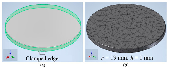 The resonance frequency of the emitter membrane was calculated for the following experimental parameters: r = 19 mm and h = 1 mm. The aluminum mechanical properties were: E = 70 × 109 Pa, v = 0.34 and = 2700 kg/m3. Figure 2 shows the used finite element model (Figure 2a) and the respective numerical mesh (Figure 2b) with a mean element size of 0.3 mm; the computation time was 10 s.
