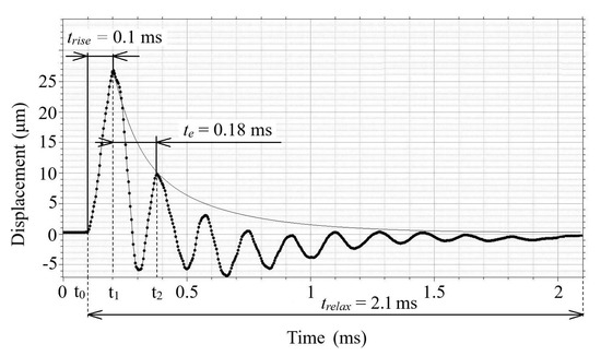 We considered the oscillations of the gas discharge emitter membrane excited by an electric current pulse. It follows from the graph in Figure 3, wherein the amplitude of the first maximum of membrane oscillations reached 26.7 μm at 0.1 ms. The second maximum of the damped oscillations (at 9.9 μm) appeared at the time = 0.18 ms when the oscillation amplitude decayed by e times in respect to the maximum value. In turn, the time of full signal relaxation was 2.1 ms. In general, the results above show that when the grade of damping of the oscillating system is low, it can be corrected by changing damping characteristics in particular applications.