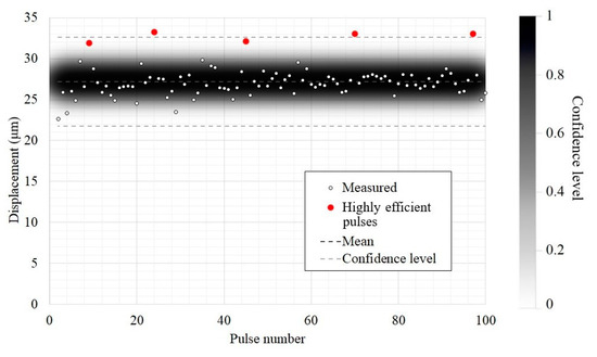 The displacement amplitude in the membrane center measured for 100 pulses (the scale on the right level of confidence).