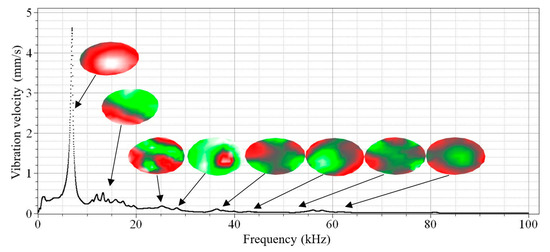 By performing SLDV in the Fast Fourier transform mode, vibration spectra were measured on the sample surface at each measurement point. In a frequency range from 50 Hz to 100 kHz, 3200 spectral lines with a step of 31.25 Hz were defined. The scan mesh step was 2 mm, thereby resulting in a total scan time of about 20 min for the above-mentioned frequency resolution. In fact, the discharge pulse rate can be increased to reduce the experiment duration, but the temperature of the emitter should be carefully controlled in this case.