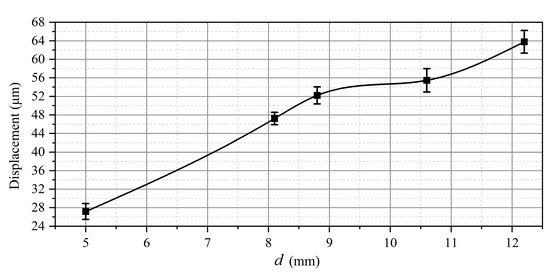 The influence of the inter-electrode distance on displacement amplitude was investigated on the aluminum membrane (diameter D = 38 mm and thickness h = 1 mm). The inter-electrode distance was varied by changing the position of the potential electrode with respect to the membrane. The minimal gap thickness was 5 mm, the channel diameter was 3 mm, and the gas discharge volume varied approximately from 15 to 35 mm3. In all cases, the pulse repetition rate was 2 Hz, and the variation of the vibration displacement in time was measured by means of laser vibrometer. The corresponding graph is presented in Figure 8 for the aluminum membrane and different inter-electrode gap thicknesses.