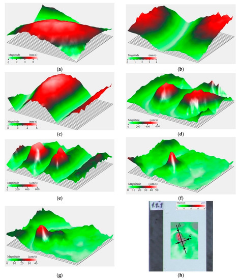 Because a short discharge pulse contains multiple frequencies, the plate under investigation will oscillate under all frequencies, which are present in the pulse. However, it is worth noting that the non-resonance frequencies will quickly decay, thus, underlying object eigenfrequencies. Figure 10 shows the scaled vibration spectrum in the range from 50 Hz to 20 kHz with a number of resonance peaks at the amplitude–frequency spectra of vibrations in the composite obtained. The obtained amplitude–frequency spectra show the distribution of vibrations on the surface of the composite while changing the distance between the test object and the membrane. To characterize such spectra, the minimal () and maximal () vibration velocities at the corresponding frequencies were determined along with the respective mean values across the whole spectrum (). Additionally, the apparent lateral dimensions of impact damage (a × b) were evaluated. The results are presented in Table 2.