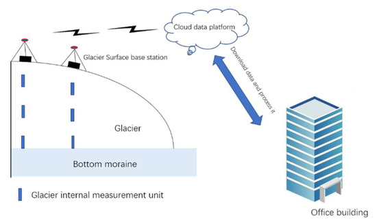 Similar to a piece of gravel, a glacier’s internal measurement unit can move with the glacier, and the wireless system can obtain true movement trajectories without the constraints of communication cables. After more than two years of tests and numerous upgrades, the unit now consumes less energy (sleepy mode: the current is only 3 µA), automatically measures real-time data according to the time interval set by the program, and the glacier base station completes the launch, save, and upload functions, including the upload of measurement data to the cloud data platform (OneNET IoT Platform). The data transmission efficiency is high and up to 2.4 kbps. The ultra-low power design in the glacier internal measurement unit permits operations to last within the range of 4 to 6 years. The network is safe for the high integration between the glacier internal measurement unit and the glacier surface base station. Temporary or seasonal field-monitoring network systems can be quickly set up to complete the measurement and upload the related parameter data instead of using manual operations. Without returning to the field to retrieve data, field costs can be dramatically reduced. The system can monitor internal movements, but this is not limited to mountain glaciers. With the improvement in the design scheme, in further research studies, the future system can also be placed in another cryosphere (such as frozen soil) to meet the actual scientific research needs. The system’s design will benefit the measurements of velocity and electrical conductivity at the bottom of a glacier, and it provides valuable technical experiences.