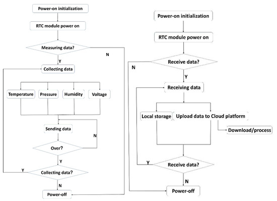 The wireless real-time monitoring system has two working modes, automatic and manual, and the former is the main working mode. When it is in the automatic working mode, it has two states: active state and power-off state. The switching between the two states is controlled by the RTC module. When the set time for measuring the data arrives, the SQW pin of the RTC module outputs a high level to the EN pin of the power management chip to supply power to the entire system. When the system enters the active state, it will complete the system’s self-test, data measurement, sending/receiving data, and other related work according to the set program; then, the SQW pin of the RTC module outputs low levels to the EN pin of the power management chip, powering off the entire system, and the system enters the powered-off state. This state is its main state. In order to save power consumption, this state is particularly important, especially for glacier internal units; since its power supply is a disposable battery. With the limited energy, the lower the power consumption, the longer the system runs. The RTC module also enters the sleep state, leaving only the clock working, and it waits for the system’s next activation. The glacier internal measurement unit generally takes less than 2 s to complete all setup procedures, and the main power consumption (maximum) occurs at the time of sending data. After completing the established procedures, the SQW pin of the RTC module turns to low levels, and the system is powered off and enters the ultra-low power consumption stage until the time to measure the data comes again.