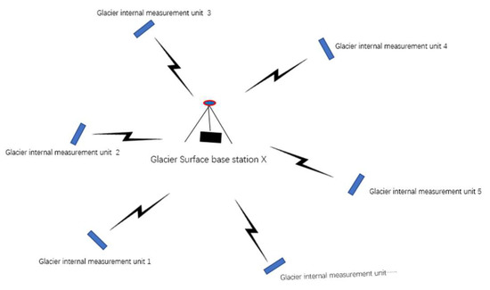 Figure 5 shows the star topology used to send data between the glacier internal measurement unit and the glacier surface base stations. The star topology has the following advantages: a simple structure, simple access protocol, easy network monitoring and management, and high reliability. Fault diagnoses and isolation are easy, and the fault of a single glacier internal measurement unit only affects itself and does not affect the entire network. As for convenient services, glacier surface base stations can easily provide services and reconfigure the network for each site. Unfortunately, the glacier surface base station is heavily burdened, forming a “bottleneck”. Once a failure occurs, the entire network will be affected.