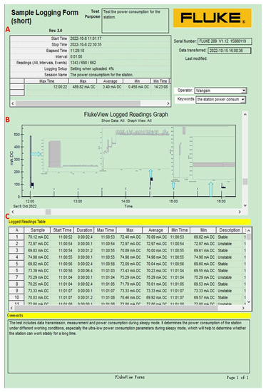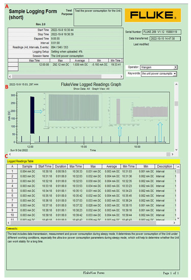 Power consumption measurement for the glacier internal measurement unit, including the logging descriptions (A, upper panel), FlukeView GRAPH (B, middle panel), and the detailed data (C, bottom panel). The black wide thick bar, the black thin bars, and the horizontal line between the two black thin bars refer to the power consumption when the unit sending measurement data within a day at a set time (12:00 a.m.), the measuring data, and when it functions in the sleep mode, respectively. Details are shown in the inner corresponding panel.