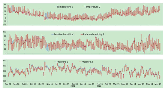 Real-time monitoring data for temperature (°C, top), relative humidity (%, middle), and pressure (hpa, bottom) from the monitoring system from 1 September 2021.