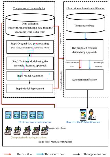 This study proposed an overall workflow based on data from computerized sewing machines at the manufacturing site, edge data transmitted to the cloud for data analytics, and automatic notification of PdM implementation (Figure 1). Previous studies have shown that statistical methods, mathematics, and data mining machine learning have been used to address the PdM issue. In some cases, machine learning approaches are extremely accurate. The ELA was used in this study for PdM in the textile manufacturing process. The input was the data collected from the e-Form, and the predictive target quality of textile products is defective or non-defective. In this study, the manufacturing data were processed according to the standard data workflow process. The “knowledge discovery-in database” involves data collection and preprocessing, modeling, model evaluation, and deployment (Figure 1). Therefore, it can provide better insights into processes while also allowing for the exploration of the value of the imported data. This study makes the most of the original data, and the analytics results are transmitted to the cloud via automatic notification. Prior to the failure event, the user can obtain the notification and perform early maintenance execution. This study proposed a resource dispatching approach; the transmitted data was applied in the arranged third-party resource to send the notification for a user.