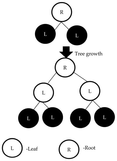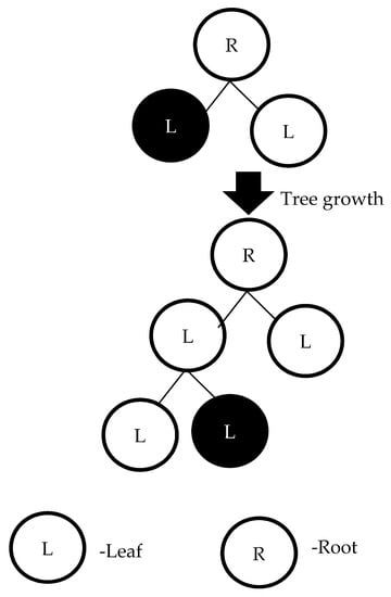 Boosting was applied in the ensemble method to improve accuracy with a small risk of reduced coverage. The gradient boosting decision tree approach is used to combine many individual decision trees and adjust the errors of the previous tree to form a strong model. All the trees are sequentially connected together. Each individual decision tree tries to minimize the error of the previous tree in the ensemble model. Due to this sequential connection, the gradient boosting decision tree has high accuracy. The outcomes of each tree were integrated to evaluate and find the optimal prediction result. Ke et al. proposed LightGBM. LightGBM is an ensemble of gradient boosting decision trees []. The LightGBM is used to maintain the high accuracy of the model while decreasing the memory usage of the computing environment. Figure 3 depicts how LightGBM grows trees using the leaf-wise method, which selects the leaf with the greatest decrease of loss based on the histogram, rather than checking all previous leaves for each new leaf [].
