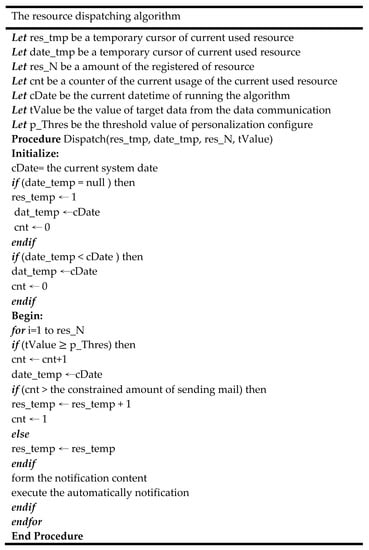 The further use of data is important for data-driven digital transformation in the manufacturing site. With the rapid development of IoT, IoT-related applications have become increasingly important. Various types of third-party resources have been widely applied in different value co-creation applications. A user can access third-party resources with limited service quotas after that user registers on the official platform. Taking emailing services as an example, the common registered user has a limited amount of free email send services per day. The notification may not be successfully sent to the user when the number of sent emails has exceeded the constrained amount of resources. To improve the efficiency of using the resource, this study proposed the resource dispatching approach and used the proposed algorithm to arrange the resource in the resource database. Figure 5 is the pseudo-code of the proposed approach. This study uses the temporary cursor and counters to implement the algorithm. In the pre-execution stage, this study pre-builds the resource database and the properties which recorded the information of the registered information, the resource usage, the updated date of resource dispatching, and the personalized notification threshold. The parameters included the amount of the registered resource from the resource base; the above parameters were imported into the algorithms. In the start stage, the algorithm provided the start for the first use (there is no existing date temporary cursor) and the date time start for the resource dispatching cross the next day. For the first use, the parameter is set as the initial value. According to the guidelines from the third-party service provider, the constrained amount of sending mail was recovered as zero on the next used day. For the date start, the counter also needs to be set as zero. After parameter start, then start to enable the algorithm main procedure. The first step is updating the time cursor as the current system date time. The second step is to estimate that the target value is achieved by the notification threshold. The function of automatically notification enabled when the data value exceeded the threshold value. The third step determines whether the current resource arranges to the next resource. The resource can still be used if the usage is on the range of the constraint amount of emailing usage. The resource was arranged to the next resource during the current usage of the currently used resource is exceeded the constraint amount of emailing usage. Finally, if the notification condition existed, and the using resource had been arranged, the arranged resource was applied in the notification by sending the email service with the customized content.