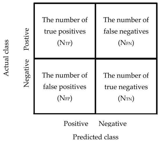 The evaluation item based on the two-dimension confused matrix, prediction and actual results, and matrix can be classified into four elements (Figure 7): false negatives (FN), true negatives (TN), false positives (FP), and true positives (TP). The element of the confused matrix is used to estimate accuracy, precision, recall rate, F1-Score, and Matthews correlation coefficient (MCC) for evaluating prediction performance. The evaluation criteria are described below.