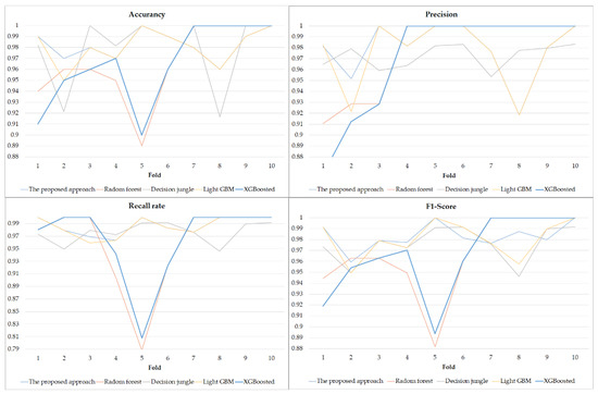 In the beginning, the original data were preprocessed using data cleaning to remove an unnecessary column. Then, the SMOTE algorithm was used to generate the new data according to the original data for data balance processing. After the data balance processing, the quantity of data with the no-defective label was enlarged from 460 to 480, and the quantity of data with the defective label was enlarged from 40 to 520. The amount of new data was 1000, and forty-eight percent of the new data had a non-defective label, and fifty-two percent of the new data had a defective label. This study used the preprocessed data to predict the defective product in the use case. In this study, K-fold cross-validation is used to evaluate the trained model to avoid the possible bias from data split. Cross-validation is a statistical approach that is widely applied to estimate the performance of machine learning models. K-fold cross-validation is a common method for comparing and selecting a model for a given predictive model by resampling the dataset recursively. The concept of K-fold cross-validation is to recursively split the original set into several subgroups, and to compute an average value over the partitions. This study used 10-fold cross validation. 80% of the dataset is used as a training dataset, 10% of the dataset is used as a validation dataset, and 10% of the dataset is used as a training dataset. The variance and standard deviation result of evaluation criteria over repeated runs is presented in Table 3. Figure 8 shows the result of each fold. Due to pseudorandom mechanisms that existed in the machine learning approach, the above results assess the variability of the machine learning approaches within 10-fold cross validation. The overall results presented low variability, which means that the ELAs could better predict the class of the product based on sample data. Table 4 showed the mean of the accuracy, precision, recall rate, F1-score, and MCC of the use of ensemble learning models within 10-fold cross validation. The results using the proposed model showed that the accuracy and the precision rate were 0.983 and 0.979, respectively. The decision jungle result showed that the accuracy and precision rate were 0.980 and 0.980, respectively. The RF had an accuracy of 0.966 and a precision rate of 0.977. The LightGBM had an accuracy of 0.981 and a precision rate of 0.976. The results showed that using LightGBM and decision jungle had similar predictive outcomes (Table 3). The ELAs applied in the experiment were based on a similar training framework. All of the ELAs used have adequate classification performance (accuracy, F1-Score, and MCC) and outstanding discrimination of the data with a defective label (precision and recall rate). The RF and XGBoost approach has more computation time than other machine learning approaches, the computation time using the proposed approach is in between the other approaches. In summary, the result obtained using the proposed method was compared with that of the LightGBM and decision jungle. Furthermore, the obtained results indicate that the ELA achieves greater than 98% accuracy in the use case.