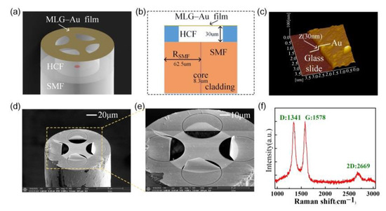 Figure 1a presents a schematic of a nanomechanical resonator based on a clamped trampoline graphene–Au membrane. The resonator consisted of three parts: a section of SMF, a section of HCF (75 μm internal diameter) and a graphene–Au membrane. The end-facet of the SMF and graphene–Au membrane acted as two reflective mirrors, forming a Fabry–Pérot interferometer (FPI). The length between the two mirrors defined the cavity length, which could be controlled according to requirements by accurately controlling the HCF length. In addition, this cavity length could be calculated from the reflection spectrum. Figure 1b shows a side-view schematic of the resonator, which consisted of an SMF, a section of HCF and a graphene–Au membrane. The graphene–Au membrane suspended on the HCF and the end-facet of the SMF were used as two reflective mirrors, forming a Fabry–Pérot cavity. The cavity between the two reflective surfaces was filled with air. Figure 1c characterizes the thickness of the Au layer on the membrane, which was measured to be about 30 nm thick by using an AFM [28,29]. Figure 1d shows a scanning electron microscopy (SEM) image of the trampoline MLG membrane covered on the fiber end-facet with an inner diameter of 75 µm and the enlarged SEM image of the membrane in Figure 1d is showed in Figure 1e. The Raman spectrum obtained from the graphene after transferring to the fiber end-facet is shown in Figure 1f and its three mode peaks were at 1341, 1578 and 2669 cm−1, and the ID/IG and I2D/IG were 0.99 and 0.25, respectively. The energy difference between the 2D and G peaks corresponded to that expected for a multilayer graphene film [30].