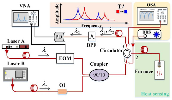 Figure 2 shows the diagram of the experimental setup. This all-optical-fiber system integrated optical excitation and optical detection. For the excitation, an intensity-modulated pump laser (Laser A with a wavelength of 1549 nm) with a power of 12 mW and frequency sweeping from 10 kHz to 1.5 MHz was employed to excite the suspended graphene/Au membrane. The pump laser (Knheras ADJUSTIK E15 PM FM, Luster LightTech International Co., Ltd., Denmark) was modulated by an electro-optic modulator (EOM) (Beijing Conquer Optics Science & Technology Co., Ltd., Beijing, China) driven by a vector network analyzer (VNA, R&S®ZNL6). Simultaneously, another probe laser (Laser B, Agilent 81940A, America) with a wavelength of 1530.01 nm and a power of 4 mW was employed to detect the mechanical vibrations of the membrane with a maximum sensitivity. These two beams from laser A and B were coupled together through a 90:10 fiber coupler and then coupled into the resonator which was placed in a heating furnace via a three-port circulator. Due to the effect of the frequency-modulated laser A, the graphene membrane on the fiber end-facet thermally expanded or shrank, causing the membrane to resonate. The vibrations generated by the graphene/Au membrane modulated the intensity of the laser B beam reflected from the silica fiber end and the MLG surface. The light reflected from the resonator passed through a tunable band-pass filter (TBF-1550-1.0-FCAPC, Newport, America) to separate the 1549 nm laser and finally, the light intensity of laser B with a wavelength of 1530.01 nm was detected by a photodetector (10 MHz adjustable photoreceiver, model 2053, New Focus, Inc., San Jose, CA, USA) via the circulator. The electric signal from the PD was further analyzed and processed by the VNA. When the frequency of the laser A matched the resonance frequency of the membrane, the amplitude of the membrane vibration was the largest; as such, the reflected light intensity also reached the largest. Therefore, there was a resonance peak on the frequency spectrum. In addition, a typical measurement setup shown in the light-yellow part was used for measuring the reflection spectrum of the resonator. This measurement system consisted of a broadband light source, a circulator and an optical spectrum analyzer (YOKOGAWA AQ6370C) with a resolution of 0.02 nm.