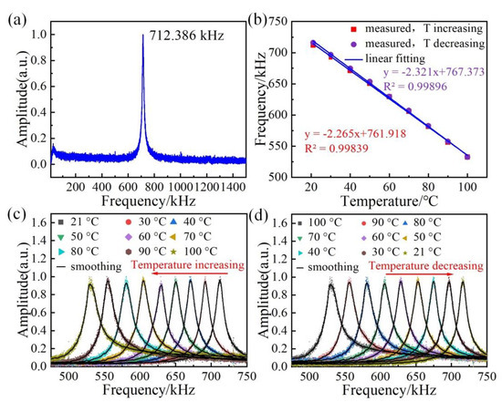 Figure 3b presents the resonance frequency, ƒ, as a function of the temperature, T, where the red squares indicate the change in resonance frequency as the temperature increases and the purple spheres represent the data as the temperature decreases. As shown in Figure 3b, by linearly fitting the experimental data, it was calculated that the thermal sensitivity was approximately 2.2646 kHz/°C with an R2 of 0.99839 during the heating process and the thermal sensitivity was about 2.3212 kHz/°C with an R2 of 0.99896 during the cooling process.