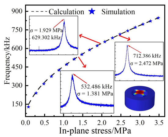 The frequency–stress relationships obtained from COMSOL simulations and calculations, respectively.