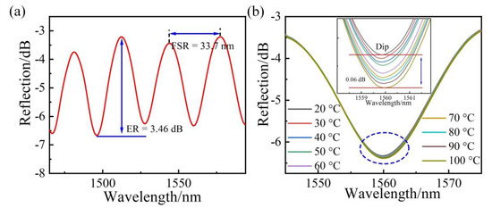 The built-in stress change of the resonator was also investigated by monitoring the interference spectroscopy. The typical experimental setup is shown in the part circled by the light-yellow part in Figure 2. The light from a broadband source (BBS) was injected into the resonator through a circulator, and then the interference light reflected from the resonator was transmitted to an optical spectrum analyzer (OSA) with a resolution of 0.02 nm. Figure 5a shows the typical reflection spectrum of the resonator, which is related to the cavity length of the resonator. As shown in Figure 5a, the resonance wavelength of one resonance dip was ~1560 nm, the extinction ratio (ER) and the free spectral range (FSR) of the interference spectrum were approximately 3.46 dB and 33.7 nm, respectively. The cavity length and fineness could be calculated to be 36 μm and 1.17, respectively. A working point of 1530.01 nm was employed to detect the mechanical vibrations of the membrane with a maximum sensitivity. The dip wavelength shift of the reflection fringe around ~1560 nm was measured while the temperature was increased from 20 to 100 °C with an increment step of 10 °C. Figure 5b shows the evolution of the resonator reflection spectrum as the temperature increased. The dip wavelength of the reflection spectra at different temperatures are more clearly described in the inset of Figure 5b. The film used for sensing was patterned into a trampoline geometry film and the pressure inside and outside the cavity was consistent. Therefore, the cavity length of the resonator was not affected by temperature. The fringe contrast of the reflection spectra had a decrease of 0.06 dB when temperature increased from 20 °C to 100 °C. Compared with other graphene fiber-optic temperature sensors [32], this obtained cavity length variation was relatively low due to the trampoline design. Therefore, we consider that the change of temperature mainly changes the stress of graphene instead of its cavity length.