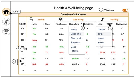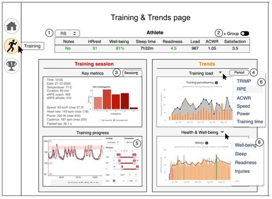 During the ideate phase in this study, all given input, scientific knowledge [5,13,15,31,35], and already-existing functionalities within the Sport Data Valley platform [23] were combined in the drawn mock-ups. As we were able to build upon the basis of an already-existing platform, we could use the infrastructure that was already implemented. Therefore, we could focus on combining data of daily questionnaires, training and activity monitoring data, and training log data in dashboard visuals and figures to provide combined insights for the coach that existing systems are not able to give [15,17,34]. Drawn mock-ups, therefore, built upon existing features but also added new features such as the Health and Well-being overview page.