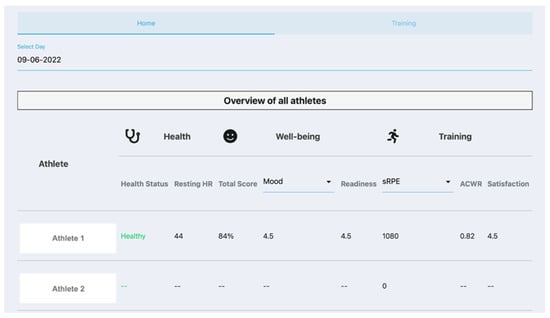 Prototyping started based on the final mock-up and already-existing functionalities and infrastructure related to monitoring of training load and well-being within the Sport Data Valley platform [23]. This online platform provides a solution that enables researchers and coaches to easily capture and analyse data, but with data privacy ensured. The following relevant infrastructure of the platform was already in use: (i) daily questionnaires for athletes to collect health and well-being status (based on [29,30,31]); (ii) training log questionnaire to collect data on the perceived training load (based on [13]), (iii) training-sensor data integration with wearable systems such as Polar, Garmin, Strava, and Fitbit, (iv) functionalities to connect and share data between athletes and coach, and (v) dashboards displaying questionnaire and training activity data. A dashboard informing the coach about data for an athlete, or a group of athletes, was, however, not present.