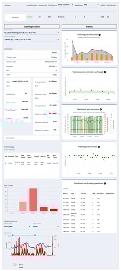 The Agile Scrum design process [33] during the prototype phase took 20 weeks and resulted in the minimum viable product dashboard as displayed in Figure 4 and Figure 5. Health and Well-being page (Figure 4) was developed according to the mock-up, only the individual warnings based on well-being measures could not be implemented due to budgetary constraints. The health, well-being, and last training sessions’ measures are displayed in an overview display for the coach. The coach can choose which date is displayed. Figure 5 shows the Training and Trends page, which is divided into two panels. The left panel displays the detailed information from one activity performed by the chosen athlete and date. Data such as training type, RPE, session RPE (sRPE), training duration, training load, average velocity, power, and heart rate, etc., can be found there. The bottom part of the left panel shows information of the fastest recorded lap during the session, time in heart rate intensity zones and a figure of training measures displayed over training time. All the addressed measures in previous phases are implemented in this part of the dashboard. Trends are displayed in the right panel of the display (Figure 5) where weekly training load, Acute-to-Chronic Workload ratio (ACWR), and well-being, resting heart rate, and sleep duration trends of the chosen athlete in weekly summarised figures. All these data were high on the needs and functionality lists of the empathise and ideate phases.