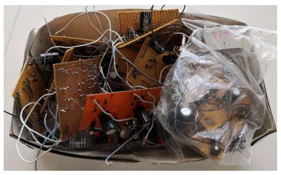 Higher education institutions that provide training for engineers often place high emphasis on practical activities and assessments. Courses in fields such as electrical and electronic engineering often rely on hardware components such as resistors, capacitors, inductors, voltage regulators, and diodes for project work. As an example, students are required to construct an electrotechnology product in the Electrical and Electronics Applications course at Waikato Institute of Technology []. The construction could be on a printed circuit board (PCB), Veroboard, or breadboard. After project work, the constructed PCBs are left in storage or thrown away (Figure 1). Used components are often discarded instead of being reused. In the circular economy concept, components on these circuit boards could be removed as part of soldering practice lessons. Since sorting parts manually is mundane, this could be achieved using an intelligent automated sorting system. Thus, this research proposes that a vision-based system be used to detect and classify parts.