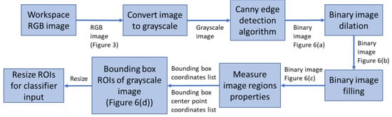 The major parts of the object (component) detection process are highlighted in Figure 5. Various image processing algorithms are applied to extract ROIs containing unclassified objects. Figure 6 shows representative images of the various stages of the object detection process.