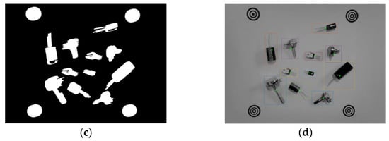 The output of the Canny edge detection algorithm is a binary image which is then dilated to further improve connectivity between the edges. This is achieved by applying a rectangular structuring element that enlarges the edges of the binary image (Figure 6b). Edge connectivity is important as the next stage involves flood-filling the binary image to form filled (solid) shapes representing the detected objects (Figure 6c). After flood-filling, the binary image is further processed by measuring the properties of the image regions. The “BoundingBox” property argument returns a set of positions and sizes of the smallest boxes, i, containing each detected object (Figure 6d) (4). This represents the ROIs. The green crosses in Figure 6d mark the bounding box centers (BBC) that represent the location of the objects in the workspace (5) and (6).