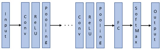 Like the SNN, the CNN classifier is also a feedforward neural network with 900 inputs (30 × 30-pixel image). It can extract features from the two-dimensional image and optimize parameters using backpropagation. The high performance of CNNs makes them a preferred deep learning architecture as outlined in Section 1 and in []. The basic structure of a CNN is shown in Figure 9. The hidden layers consist of a series of convolution, rectified linear unit (ReLU), and pooling layers. In the convolution layer, the image is examined by applying a filter smaller than the original image to determine its properties. Following this, the ReLU layer removes negative values from the output of the convolution layer. The pooling layer reduces the original size of the image by retaining important features and ignoring unnecessary features in the image. The fully connected (FC) layer converts the matrix image into a flat vector for the SoftMax function to determine the output classification.
