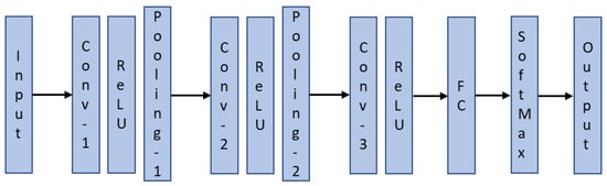 The architecture of the proposed CNN inspired by [] has three convolution layers, two pooling layers, one fully connected layer, softmax, and an output classification layer as shown in Figure 10. The filter size for all three convolution layers is set to 4 × 4 with a stride of 1. A filter size of 3 × 3 is utilized for the two pooling layers and the stride is set to 3.