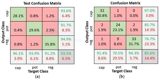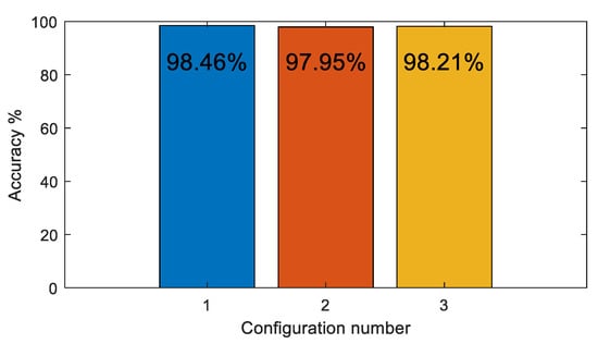 The CNN classifier model was tested with a 4 × 4 filter size for all convolution layers and a 3 × 3 filter size for the pooling layers. The stride in the convolution and pooling layers was set to one and three, respectively. The number of filters in the convolution layers was varied as shown in Table 2. Table 3 shows the CNN model training parameters. As shown in Figure 15, there was little change in overall accuracy when the number of filters in the convolution layers varied. Hence, Configuration 1 was selected since it has the least number of filters. Figure 16 illustrates the test confusion matrix and the confusion matrix of the real-world test with 104 new objects for the CNN classifiers using Configuration 1.